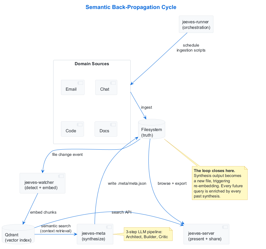 The Jeeves platform comprises four services—jeeves-runner (orchestration), jeeves-watcher (ingestion and indexing), jeeves-meta (synthesis), and jeeves-server (presentation and sharing)—coordinated through the filesystem and HTTP APIs, with a shared core library providing conventions and plugin infrastructure. The watcher manages an embedded Qdrant vector store, shown separately in the diagram for clarity. Here’s how the components interact in the back-propagation cycle: